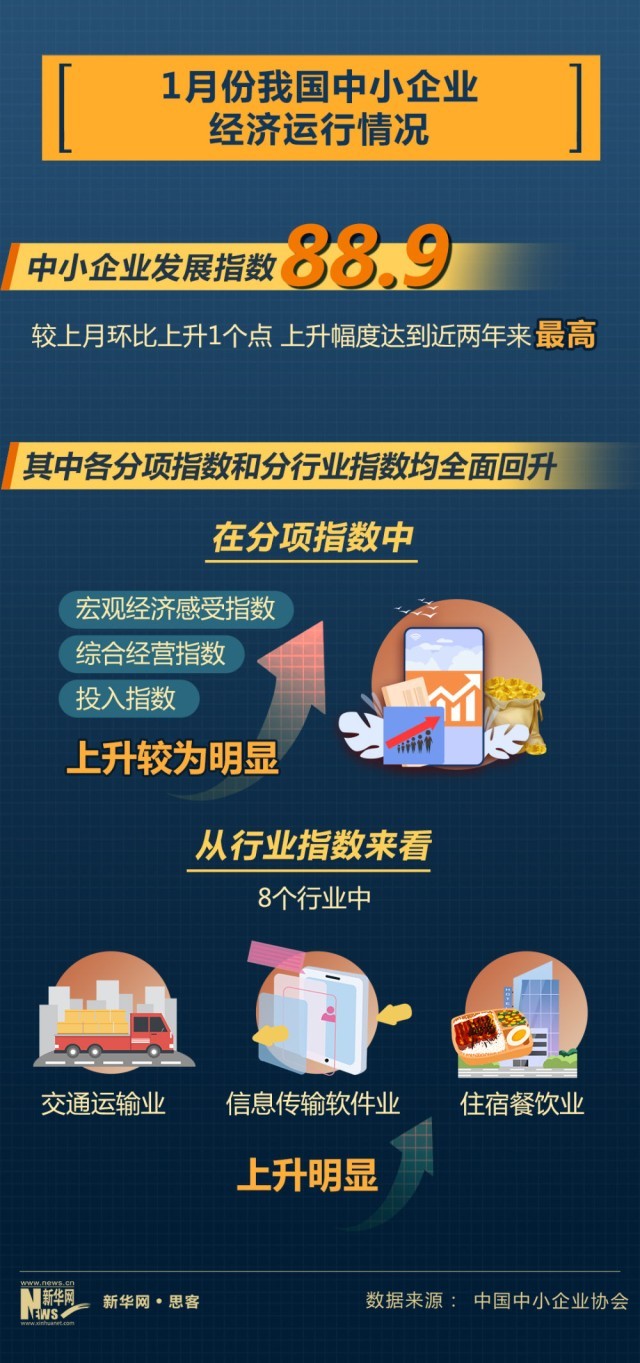 近日中國中小企業(yè)協(xié)會公布我國中小企業(yè)經濟運行情況。2023年1月份,中國中小企業(yè)發(fā)展指數(shù)為88.9,比去年12月回升1個點,上升幅度達到近兩年來最高。其中,企業(yè)發(fā)展信心回升,反映企業(yè)信心狀況的宏觀經濟感受指數(shù)為98.7,比上月上升2.1點。市場預期有所提振,市場指數(shù)為80.7,環(huán)比上升0.9點。