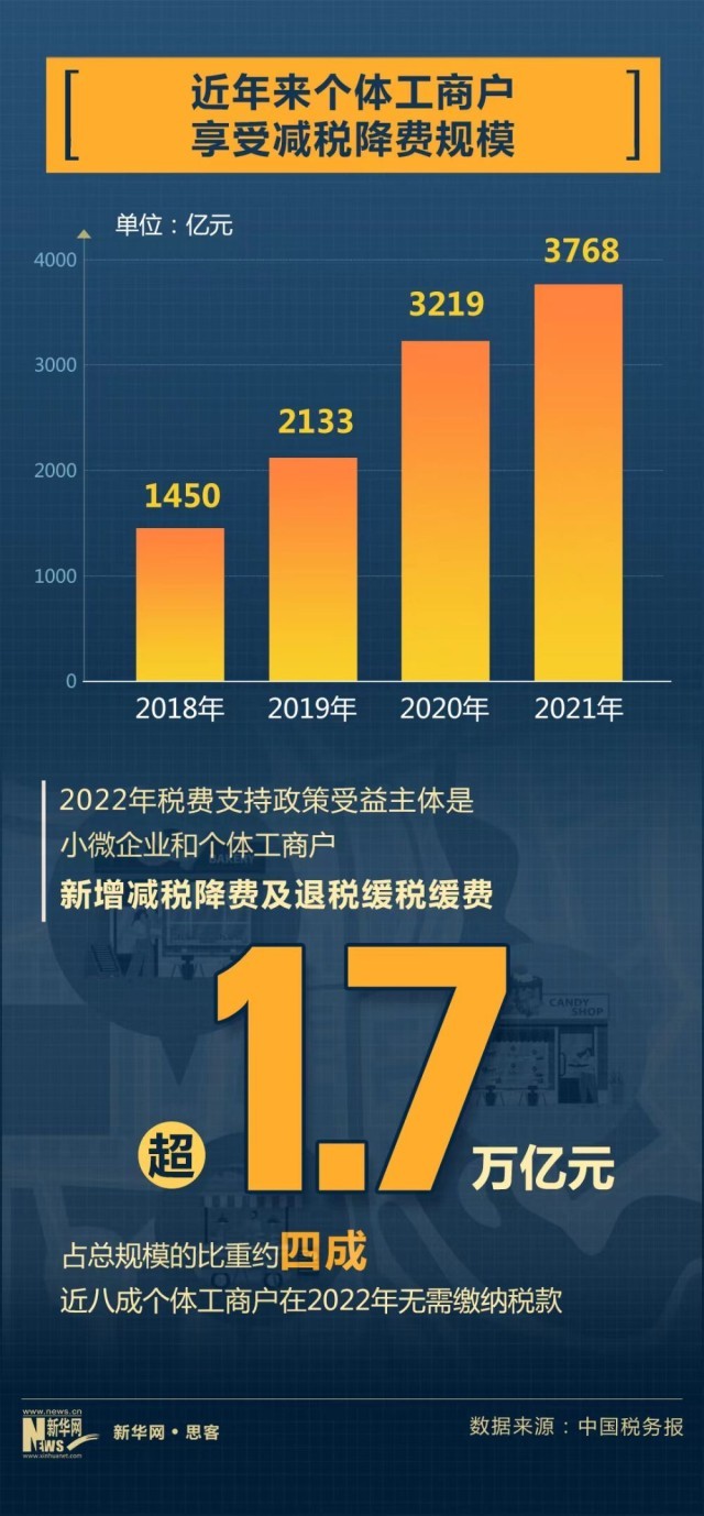 2021年,我國將包括個體工商戶在內的小規(guī)模納稅人增值稅免稅月銷售額從10萬元提高到15萬元,對個體工商戶應納稅所得額不超過100萬元的部分,在已有優(yōu)惠政策的基礎上減半征收個人所得稅。