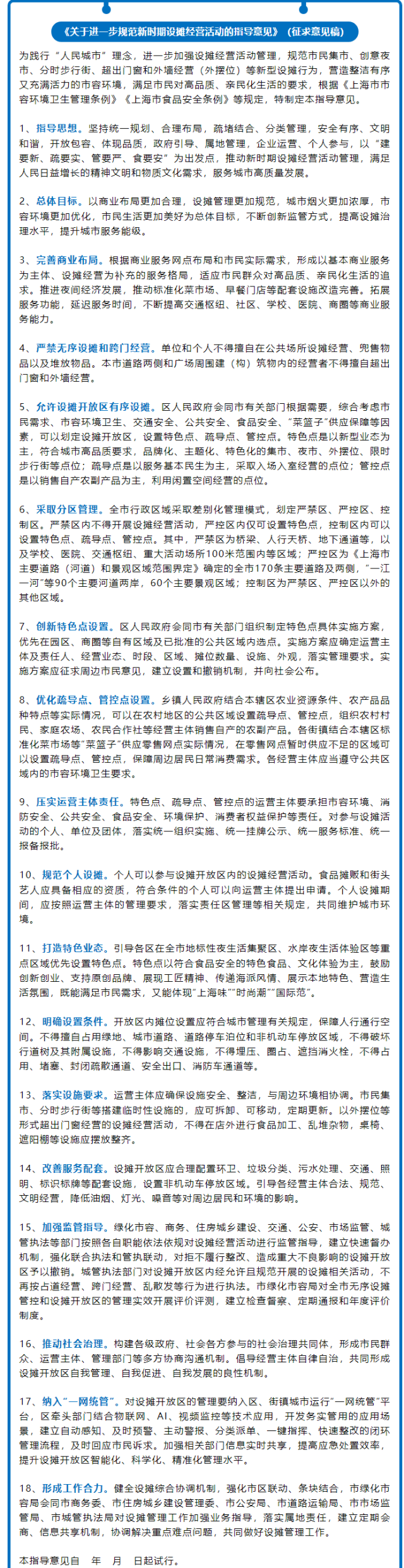 央視網(wǎng)消息:據(jù)“綠色上?!惫娞?月20日消息,根據(jù)《上海市市容環(huán)境衛(wèi)生管理條例》,為進一步加強設(shè)攤經(jīng)營活動管理,規(guī)范市民集市、創(chuàng)意夜市、分時步行街、超出門窗和外墻經(jīng)營(簡稱外擺位)等新型設(shè)攤行為,結(jié)合上海市實際,上海市綠化和市容管理局經(jīng)會同市相關(guān)部門研究,擬定了《關(guān)于進一步規(guī)范新時期設(shè)攤經(jīng)營活動的指導(dǎo)意見》(征求意見稿),現(xiàn)面向社會公開征求意見。市民和各單位可以將書面意見直接寄送至上海市膠州路768號308室,郵編:200040;也可以發(fā)送電子郵件至shsrglc@126.com。征求意見截止日期:2023年3月22日。