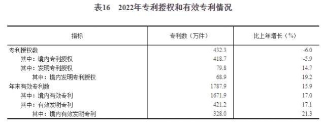 全年授予專利權(quán)432.3萬件,比上年下降6.0%;PCT專利申請(qǐng)受理量7.4萬件。截至年末,有效專利1787.9萬件,其中境內(nèi)有效發(fā)明專利328.0萬件。每萬人口高價(jià)值發(fā)明專利擁有量9.4件。全年商標(biāo)注冊617.7萬件,比上年下降20.2%。全年共簽訂技術(shù)合同77萬項(xiàng),技術(shù)合同成交金額47791億元,比上年增長28.2%。我國公民具備科學(xué)素質(zhì)的比例達(dá)到12.93%。