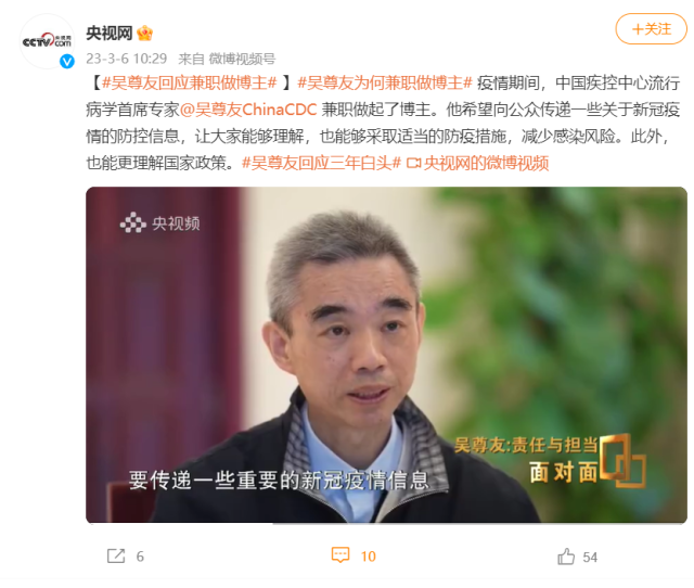 疫情期間,吳尊友兼職做起了博主。他希望向公眾傳遞一些關于新冠疫情的防控信息,讓大家能夠理解,也能夠采取適當的防疫措施,減少感染風險。此外,也能更理解國家政策。