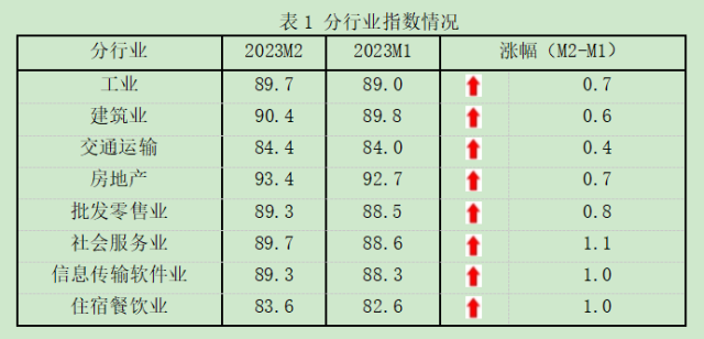 2月份,隨著經(jīng)濟逐步恢復,8個行業(yè)指數(shù)均連續(xù)兩個月上升。服務(wù)業(yè)指數(shù)恢復速度領(lǐng)先,其中,社會服務(wù)業(yè)、信息傳輸計算機服務(wù)軟件業(yè)、住宿餐飲業(yè)和批發(fā)零售業(yè)指數(shù)分別上升1.1、1.0、1.0和0.8點。