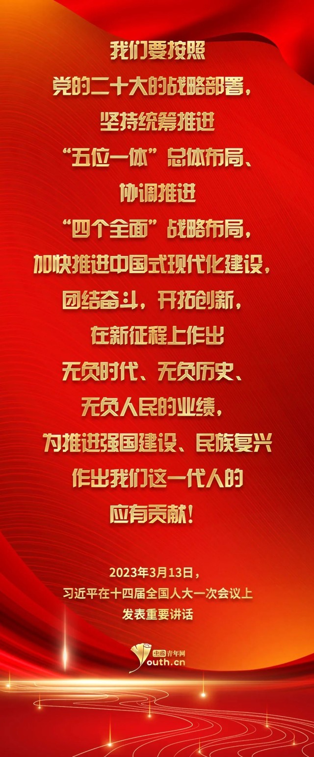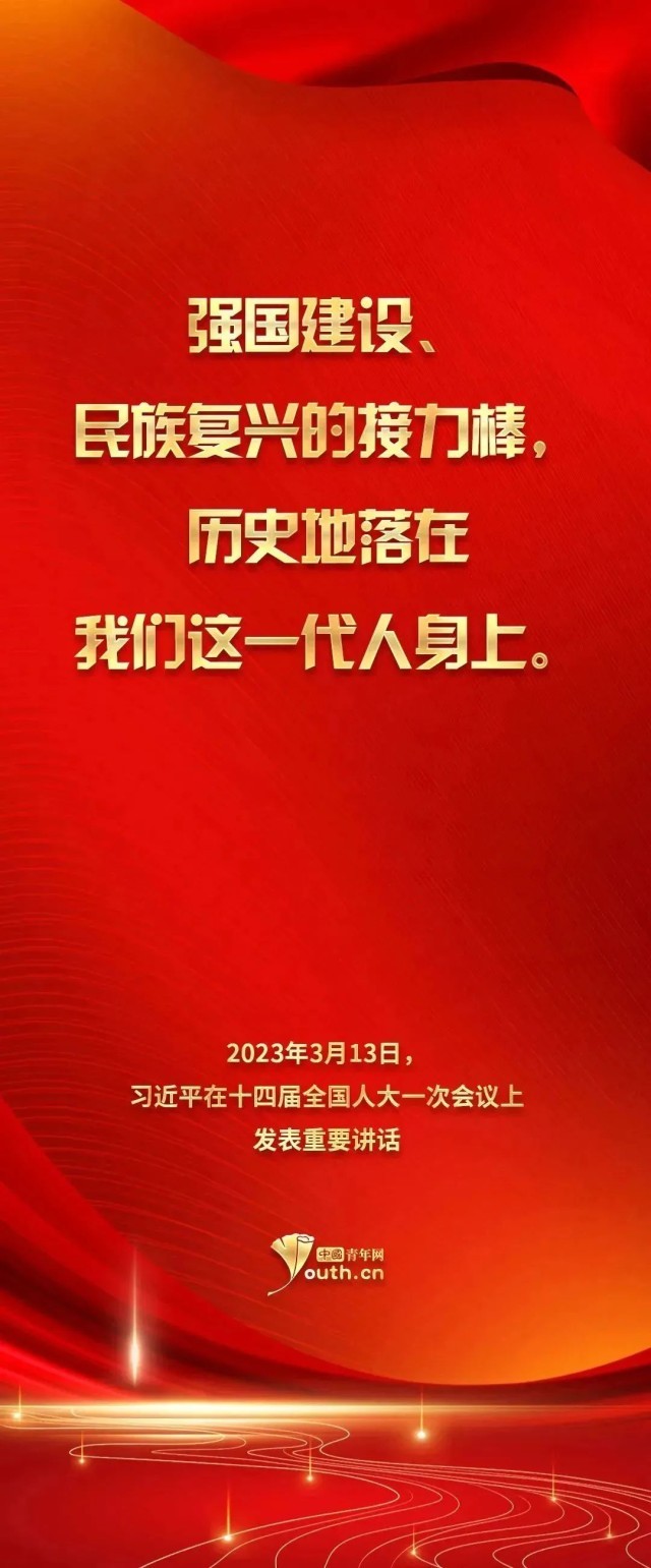 主講人:青年朋友們大家好,我是來自東北林業(yè)大學(xué)馬克思主義學(xué)院的于冰。3月13日,習(xí)近平主席在十四屆全國人大一次會議上發(fā)表重要講話指出,強國建設(shè)、民族復(fù)興的接力棒,歷史地落在我們這一代人身上。我們今天圍繞這一主題展開學(xué)習(xí)。首先,咱們來學(xué)習(xí)體悟習(xí)主席講話中的一些金句。