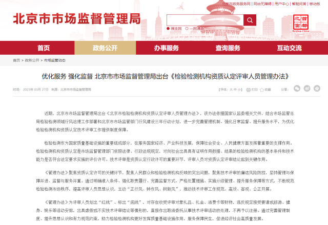 北京市市場監(jiān)督管理局出臺《檢驗檢測機構(gòu)資質(zhì)認(rèn)定評審人員管理辦法》