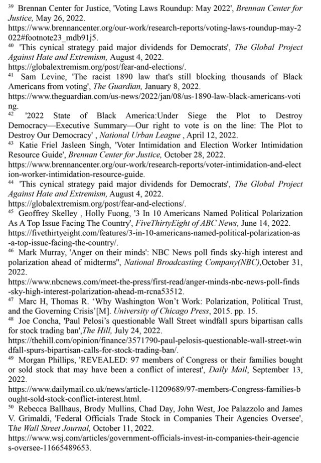 多重手法并用操弄選舉結(jié)果?!霸S多美國人完全摒棄了平等的觀念,而常常正是由這些摒棄平等觀念的人制定他人不得不遵守的規(guī)則?!保ㄗ?8)限制選民投票資格的法律頻繁出臺。布倫南司法中心2022年5月26日發(fā)表的研究指出,2021年美國有18個州通過了34項(xiàng)限制投票的法律。在2022年的立法季,有39個州的立法機(jī)關(guān)審議了至少393項(xiàng)限制性法案,通過設(shè)置一系列投票障礙,極大地制約了有色人種選民行使投票權(quán)。亞利桑那州頒布了規(guī)制選民登記中提供身份證明文件的法律,多達(dá)20萬名選民可能面臨被取消登記的風(fēng)險。(注39)“全球反對仇恨和極端主義組織”2022年8月4日發(fā)表題為《美國人的恐懼感抑制民主參與》的報告指出,40%的非洲裔和37%的拉美裔美國人擔(dān)心被剝奪投票權(quán)利。(注40)英國《衛(wèi)報》網(wǎng)站2022年1月8日發(fā)表題為《1890年的種族主義法律仍在阻止成千上萬的美國黑人投票》的文章指出,嚴(yán)苛的投票資格法律阻止了密西西比州近16%適齡投票的非洲裔美國人進(jìn)行投票。該州作為非洲裔最集中的地區(qū)之一,一個多世紀(jì)以來從未選舉出一名非洲裔擔(dān)任公職。(注41)“美國城市聯(lián)盟”2022年4月12日發(fā)布《2022年非洲裔美國人狀況報告:摧毀民主的陰謀籠罩之下》指出,過去一年,有20個州利用人口普查數(shù)據(jù)重新劃分選區(qū),剝奪了非洲裔等大量少數(shù)族裔選民的投票權(quán)。(注42)這些操縱選舉的手段變相剝奪了大量選民的投票資格,平等的選舉權(quán)名存實(shí)亡。
