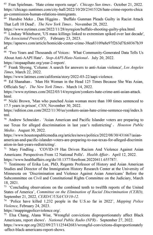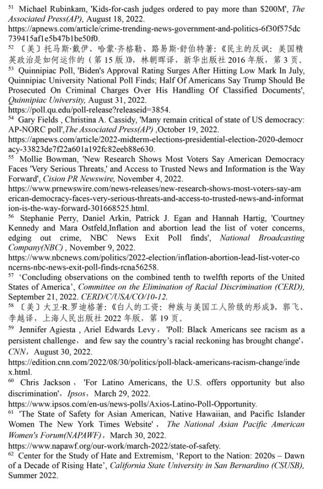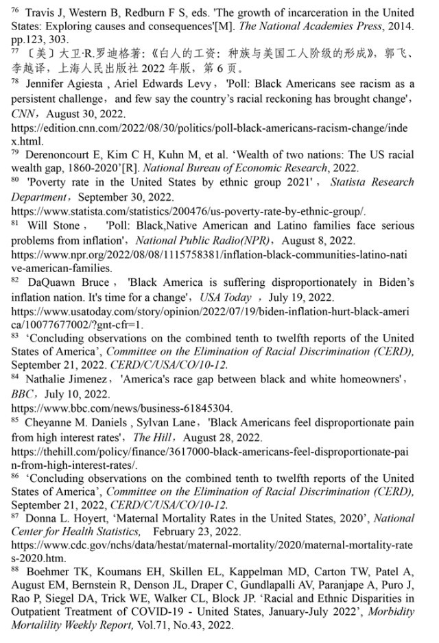 聯(lián)合國消除種族歧視委員會2022年9月21日發(fā)布的關(guān)于審議美國履行《消除一切形式種族歧視國際公約》情況的結(jié)論性報告指出,美國歷史上殖民主義和奴隸制留下的陰影至今仍揮之不去,助長著美國社會流行的種族主義。近幾年來,美國仇恨犯罪和仇恨言論事件顯著增加,與種族有關(guān)的槍支死傷人數(shù)大幅增加,有色人種和少數(shù)族裔在醫(yī)療、教育、住房等領(lǐng)域持續(xù)面臨系統(tǒng)性歧視。(注57)