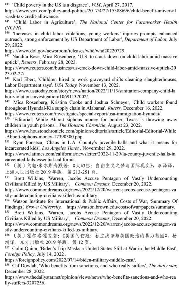 非法使用童工現(xiàn)象屢禁不止。根據(jù)非盈利組織“美國農(nóng)場工人健康中心”的數(shù)據(jù),美國有30萬至80萬名未成年人在農(nóng)場工作。(注145)美國《石板》網(wǎng)絡(luò)雜志指出,美國很多快餐店違反保護(hù)兒童健康與教育的規(guī)定,雇用青少年超時工作。童工問題屢禁不止,根源是美國法律體系存在漏洞。受新冠疫情和供應(yīng)鏈危機(jī)影響,美國多地出現(xiàn)“用工荒”現(xiàn)象,多州批準(zhǔn)新法案延長未成年人工作時間。根據(jù)美國勞工部的數(shù)據(jù),2022年,美國有數(shù)百萬青少年受雇在農(nóng)業(yè)、食品服務(wù)、零售、娛樂和建筑行業(yè)工作。(注146)路透社2023年2月28日報道,美國非法雇傭童工問題日益嚴(yán)重,自2018年以來,被非法雇用的童工激增了近70%。根據(jù)美國勞工部的數(shù)據(jù),2022財年有835家企業(yè)違法雇用3800名兒童,受雇專門從事危險工作的兒童增加了26%。(注147)《今日美國報》2022年11月13日報道,威斯康星州帕克斯清潔服務(wù)公司雇用了30多名13至17歲的未成年人在肉類加工廠和農(nóng)場擔(dān)任清潔工。幾名未成年雇員在工作中受傷,其中一名13歲兒童被腐蝕性清潔化學(xué)品燒傷。(注148)路透社2022年12月16日報道,在阿拉巴馬州至少有四家汽車零部件供應(yīng)商被發(fā)現(xiàn)雇傭童工,勞務(wù)派遣機(jī)構(gòu)將未成年人移民安置在工廠工作。(注149)時至今日,美國仍是聯(lián)合國193個會員國中唯一沒有批準(zhǔn)《兒童權(quán)利公約》的國家,解決雇傭童工問題的前景依然黯淡。