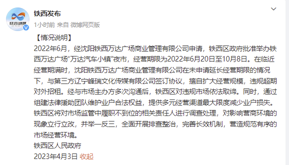 央視網(wǎng)消息:據(jù)@鐵西發(fā)布 微博4月3日消息,鐵西區(qū)人民政府發(fā)布情況說明。2022年6月,經(jīng)沈陽(yáng)鐵西萬(wàn)達(dá)廣場(chǎng)商業(yè)管理有限公司申請(qǐng),鐵西區(qū)政府批準(zhǔn)舉辦鐵西萬(wàn)達(dá)廣場(chǎng)“萬(wàn)達(dá)汽車小鎮(zhèn)”夜市,經(jīng)營(yíng)期限為2022年6月20日至10月8日。在臨近經(jīng)營(yíng)期滿時(shí),沈陽(yáng)鐵西萬(wàn)達(dá)廣場(chǎng)商業(yè)管理有限公司在未申請(qǐng)延長(zhǎng)經(jīng)營(yíng)期限的情況下,與第三方遼寧峰瑞文化傳媒有限公司簽訂協(xié)議,擅自擴(kuò)大經(jīng)營(yíng)規(guī)模,違規(guī)超期對(duì)外招租。經(jīng)與市場(chǎng)主辦方多次溝通后,鐵西區(qū)對(duì)違規(guī)市場(chǎng)依法取締。同時(shí),通過組建法律援助團(tuán)隊(duì)維護(hù)業(yè)戶合法權(quán)益,提供多元經(jīng)營(yíng)渠道最大限度減少業(yè)戶損失。