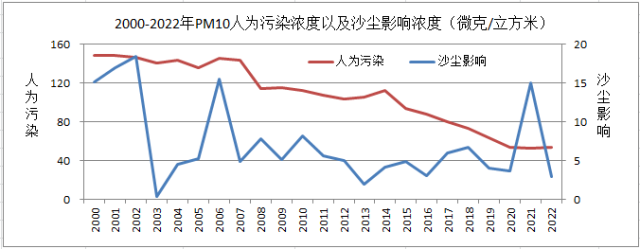 2000-2022年PM10人為污染濃度以及沙塵影響濃度變化圖。圖片來源:北京市生態(tài)環(huán)境監(jiān)測中心
