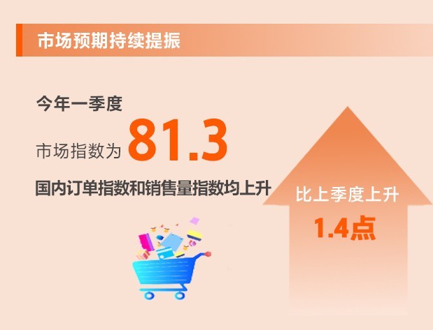 今年以來經(jīng)濟循環(huán)加快暢通,市場需求逐步恢復,消費勢頭有所好轉(zhuǎn),市場預期明顯恢復。一季度,市場指數(shù)為81.3,環(huán)比上升1.4點。所調(diào)查的8個行業(yè)中,國內(nèi)訂單指數(shù)和銷售量指數(shù)均上升,7個行業(yè)銷售價格指數(shù)上升。