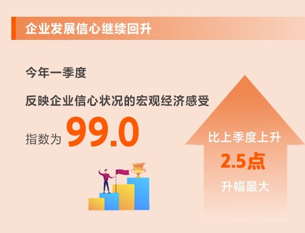 今年以來,我國經(jīng)濟運行持續(xù)回暖,增長動能不斷釋放,發(fā)展信心明顯增強。一季度,反映企業(yè)信心狀況的宏觀經(jīng)濟感受指數(shù)為99.0,比上季度上升2.5點,升幅最大。從宏觀經(jīng)濟感受指數(shù)的細項看,宏觀感受指數(shù)為103.6,比上季度上升2.4點,高于景氣臨界值100;行業(yè)運行指數(shù)為94.3,比上季度上升2.6點,升幅較大。