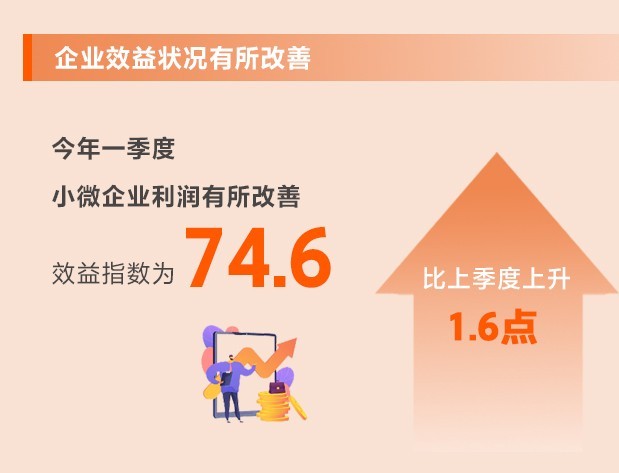 企業(yè)生產(chǎn)經(jīng)營加速恢復,原材料價格漲幅收窄,以及延續(xù)優(yōu)化減稅降費政策減輕企業(yè)負擔,小微企業(yè)利潤有所改善。一季度,效益指數(shù)為74.6,比上季度上升1.6點,反彈幅度較大,但仍處于歷史較低位。所調(diào)查的8個行業(yè)效益指數(shù)均有所上升。