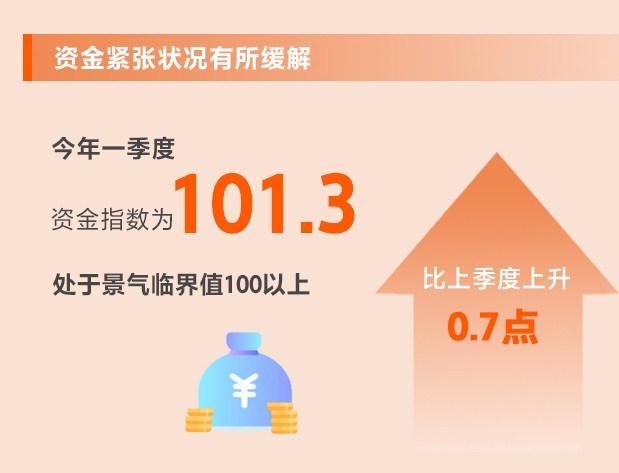 央行降準以及指導金融機構繼續(xù)支持小微企業(yè),多措并舉“精準滴灌”,小微企業(yè)融資狀況不斷改善。一季度,資金指數(shù)為101.3,比上季度上升0.7點,處于景氣臨界值100以上。其中,流動資金指數(shù)為86.3,比上季度上升1.1點;融資指數(shù)為90.8,環(huán)比上升0.5點。所調(diào)查的8個行業(yè)中,8個行業(yè)流動資金指數(shù)、6個行業(yè)融資指數(shù)均上升。