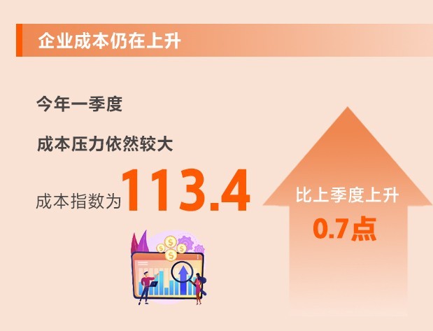 全球通脹仍處于高位,美聯(lián)儲急速加息對世界經(jīng)濟影響的外溢效應持續(xù)顯現(xiàn)。中小企業(yè)多位于產(chǎn)業(yè)鏈下游且面對消費者,需求疲弱情況下難以轉(zhuǎn)嫁上游原材料價格上漲的壓力,同時還面臨人力成本上行以及房屋租金較高等困難。一季度,成本指數(shù)為113.4,比上季度上升0.7點,仍處于不景氣區(qū)間,說明成本壓力依然較大。所調(diào)查的8個行業(yè)中,7個行業(yè)生產(chǎn)成本指數(shù)、8個行業(yè)勞動力成本指數(shù)均上升。