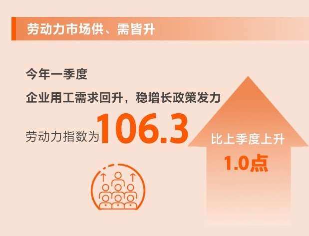 隨著生產(chǎn)生活秩序的恢復,人員流動性的提高,企業(yè)用工需求開始回升,同時穩(wěn)增長政策持續(xù)發(fā)力,從業(yè)人數(shù)有所上升。一季度,勞動力指數(shù)為106.3,比上季度上升1.0點。其中,供應指數(shù)為113.6,比上季度上升0.1點;需求指數(shù)為98.9,比上季度上升1.9點。