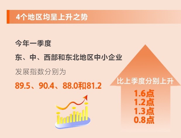 一季度,東、中、西部和東北地區(qū)中小企業(yè)發(fā)展指數(shù)分別為89.5、90.4、88.0和81.2,比上季度分別上升1.6、1.2、1.3和0.8點,東部地區(qū)指數(shù)上升幅度最大,中部地區(qū)指數(shù)最高,說明東部和中部地區(qū)經(jīng)濟和中小微企業(yè)恢復較快。