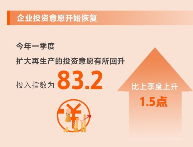 各地投向基礎領域、短板領域、科技創(chuàng)新領域的項目和計劃增多,企業(yè)對未來的信心有所增強,擴大再生產(chǎn)的投資意愿有所回升。一季度,投入指數(shù)為83.2,比上季度上升1.5點,所調(diào)查的8個行業(yè)投入指數(shù)均上升。