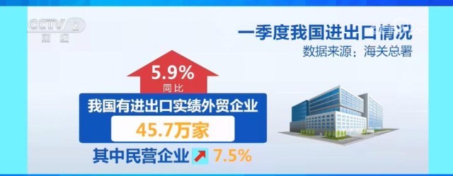 一季度,我國貨物進(jìn)出口總額98877億元。其中,出口56484億元,同比增長8.4%,保持了較快增長,特別是我國對“一帶一路”沿線國家進(jìn)出口增長16.8%,對RCEP其他成員國的進(jìn)出口增長7.3%。同時(shí),我國外貿(mào)競爭新優(yōu)勢、增長新動(dòng)能不斷培育壯大。一季度電動(dòng)載人汽車、鋰電池、太陽能電池出口同比分別增長122.3%、94.3%和23.6%,合計(jì)增長66.9%,同比增量超過1000億元,拉高了出口整體增速2個(gè)百分點(diǎn)。此外,一季度,我國有進(jìn)出口實(shí)績外貿(mào)企業(yè)45.7萬家,同比增長5.9%。其中,民營企業(yè)增加7.5%,外貿(mào)經(jīng)營主體數(shù)量穩(wěn)中有增,顯示外貿(mào)“熱度”穩(wěn)步提升。