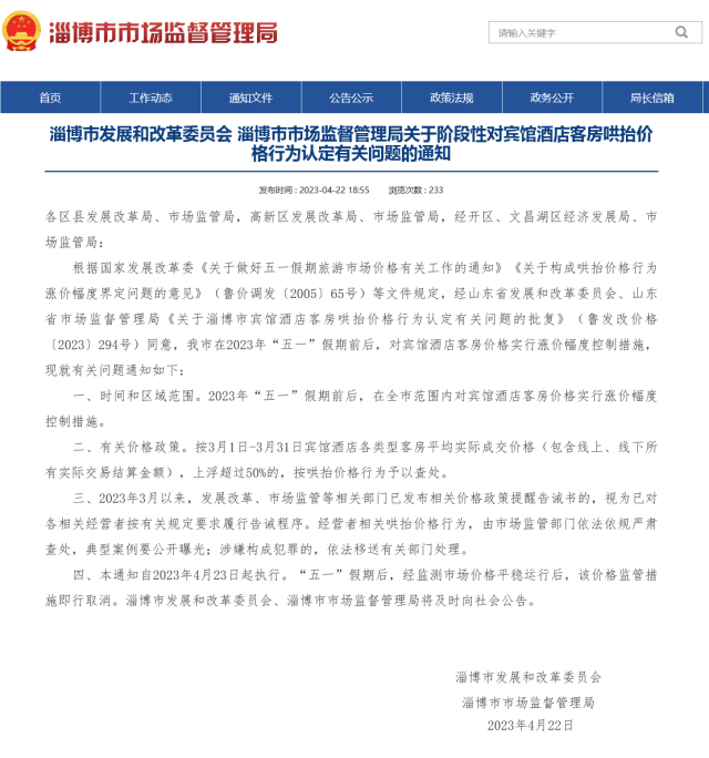 央視網(wǎng)消息:4月22日,淄博市發(fā)展和改革委員會(huì)、淄博市市場(chǎng)監(jiān)督管理局聯(lián)合發(fā)布《關(guān)于階段性對(duì)賓館酒店客房哄抬價(jià)格行為認(rèn)定有關(guān)問題的通知》(以下簡(jiǎn)稱《通知》)?!锻ㄖ访鞔_,2023年“五一”假期前后,在全市范圍內(nèi)對(duì)賓館酒店客房?jī)r(jià)格實(shí)行漲價(jià)幅度控制措施。按3月1日至3月31日賓館酒店各類型客房平均實(shí)際成交價(jià)格(包含線上、線下所有實(shí)際交易結(jié)算金額),上浮超過50%的,按哄抬價(jià)格行為予以查處。通知全文如下: