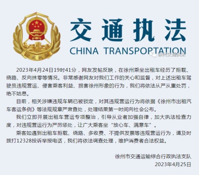 中新網(wǎng)4月25日電 據(jù)徐州市交通運(yùn)輸綜合行政執(zhí)法支隊(duì)微信公眾號(hào)消息,2023年4月24日19時(shí)41分,網(wǎng)友發(fā)帖反映,在徐州乘坐出租車經(jīng)歷了拒載、繞路、反向抹零等情況。