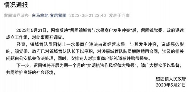 城管與水果商戶沖突?河南留固鎮(zhèn):涉事城管隊(duì)隊(duì)長(zhǎng)停職、隊(duì)員解除合同