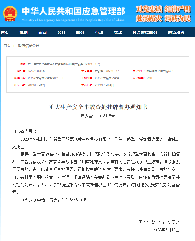 據(jù)應(yīng)急管理部消息,5月24日,國(guó)務(wù)院安全生產(chǎn)委員會(huì)發(fā)布重大生產(chǎn)安全事故查處掛牌督辦通知書。