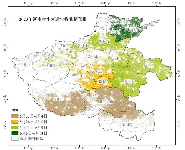 根據(jù)河南省氣象臺早前發(fā)布的消息,今年我省小麥適宜收獲期預計在5月23日-6月13日,大部地區(qū)接近常年,豫南地區(qū)略提前。其中:信陽、南陽、駐馬店適宜收獲期在5月23日-6月4日;漯河、平頂山、許昌、鄭州適宜收獲期在5月26日-6月6日;周口、商丘、開封、新鄉(xiāng)、焦作、洛陽、濟源適宜收獲期在5月31日-6月9日;三門峽、鶴壁、濮陽、安陽適宜收獲期在6月6日-13日。