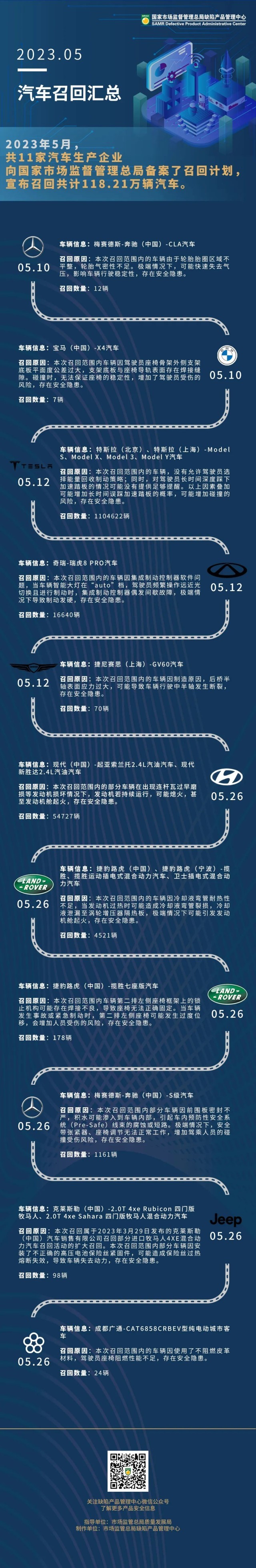 據(jù)“市說新語”微信公眾號(hào)6月7日消息,2023年5月共11家汽車生產(chǎn)企業(yè)向市場監(jiān)管總局備案了召回計(jì)劃,宣布號(hào)回共計(jì)118.21萬輛汽車。