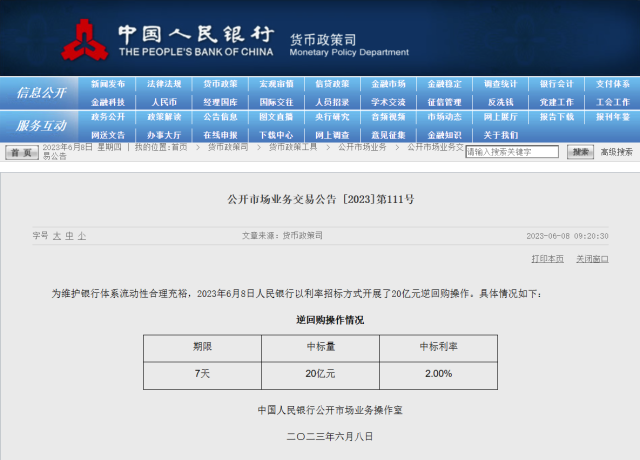 據(jù)央行官網(wǎng)消息,為維護(hù)銀行體系流動性合理充裕,2023年6月8日中國人民銀行以利率招標(biāo)方式開展了20億元逆回購操作。具體情況如下: