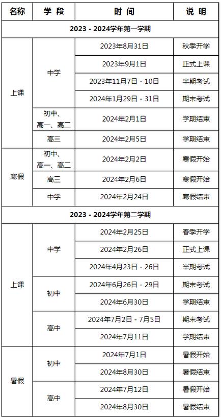 新學期開學時間:秋季學期,高三年級于2023年8月24日開學;其他年級(含幼兒園)于8月31日報名,9月1日正式上課。