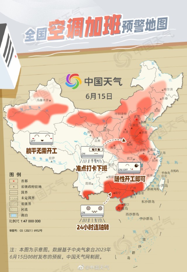 眼下,我國北方今年以來最大范圍高溫天氣仍在持續(xù)中,今明兩天(6月15日-16日)強度將達到鼎盛,京津冀等7省區(qū)市部分地區(qū)將出現(xiàn)37℃以上的高溫天氣,局地甚至會挑戰(zhàn)同期最熱紀錄。江南、華南等地雖沒有高溫天氣,但體感也相當悶熱。@中國天氣 特別推出全國空調(diào)加班預警地圖,看哪里的空調(diào)需要24小時連軸轉(zhuǎn)。