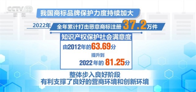 央視網(wǎng)消息:第十三屆中國國際商標品牌節(jié)昨天(6月17日)在東莞開幕,國家知識產(chǎn)權局相關負責人介紹,我國商標品牌保護力度持續(xù)加大,2022年全年累計打擊惡意商標注冊37.2萬件,知識產(chǎn)權保護社會滿意度由2012年的63.69分提升到去年的81.25分,整體步入良好階段,有利支撐了良好的營商環(huán)境和創(chuàng)新環(huán)境。