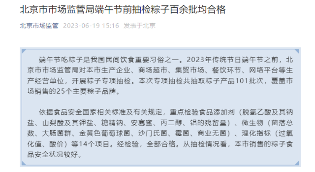 北京市市場監(jiān)管局:端午節(jié)前抽檢粽子百余批均合格