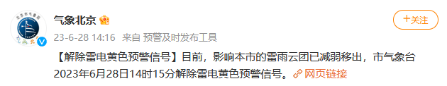 央視網(wǎng)消息:據(jù)@氣象北京微博消息,北京市解除冰雹黃色預(yù)警:目前,影響本市的雷雨云團已減弱移出,市氣象臺2023年6月28日14時15分解除雷電黃色預(yù)警信號。