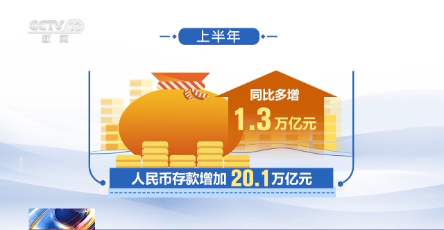 此外數(shù)據(jù)顯示,上半年人民幣存款增加20.1萬億元,同比多增1.3萬億元。