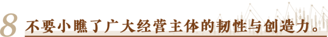 書寫這份“中國經(jīng)濟(jì)半年報(bào)”的,不光是宏觀政策的制定者,還有億萬經(jīng)營主體。它們在市場經(jīng)濟(jì)風(fēng)風(fēng)雨雨中摸爬滾打過來,承載著就業(yè),創(chuàng)造著財(cái)富,推動(dòng)著創(chuàng)新,體現(xiàn)著社會(huì)責(zé)任。無論是服務(wù)業(yè)還是制造業(yè),無論是傳統(tǒng)產(chǎn)業(yè)還是戰(zhàn)略性新興產(chǎn)業(yè),哪一行哪一業(yè),缺得了充滿活力的經(jīng)營主體?看宏觀政策是否有效,標(biāo)準(zhǔn)之一就是看能否持續(xù)廣泛激發(fā)經(jīng)營主體的活力。一句話,任何時(shí)候都不要小瞧了廣大經(jīng)營主體的韌性與創(chuàng)造力,尊重他們,幫助他們,相信他們。