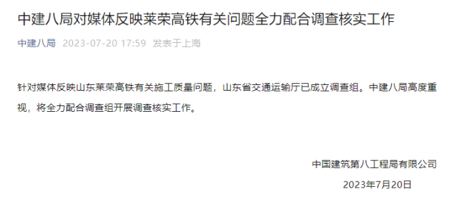 央視網消息:據“中建八局”公眾號消息,中國建筑第八工程局有限公司表示,針對媒體反映山東萊榮高鐵有關施工質量問題,山東省交通運輸廳已成立調查組。中建八局高度重視,將全力配合調查組開展調查核實工作。