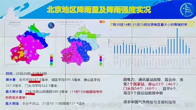 微博賬號“中國氣象愛好者”發(fā)布消息稱,北京西部大量氣象站因特大暴雨導致電力通信和設備故障失聯(lián) 來源:微博