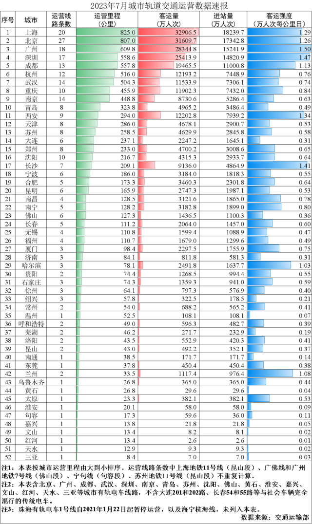 央視網(wǎng)消息:據(jù)“交通運輸部”微信公眾號消息,2023年7月,31個?。ㄗ灾螀^(qū)、直轄市)和新疆生產(chǎn)建設兵團共有54個城市開通運營城市軌道交通線路296條,運營里程9743.5公里,實際開行列車324萬列次,完成客運量26.6億人次,進站量16億人次。7月份,客運量環(huán)比增加2.2億人次、增長9.2%,同比增加7.1億人次、增長36.4%,較2019年月均客運量增加6.7億人次、增長33.8%。7月份客運強度平均水平為0.546萬人次每公里日,與2019年全年客運強度平均水平持平。