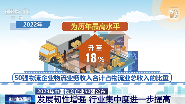 中國(guó)物流與采購(gòu)聯(lián)合會(huì)今天發(fā)布了2023年度中國(guó)物流企業(yè)50強(qiáng)。從物流業(yè)務(wù)收入占比來看,50強(qiáng)物流企業(yè)的物流業(yè)務(wù)收入占物流業(yè)總收入的比重升至歷年最高,并且50強(qiáng)物流企業(yè)門檻大幅提高,顯示物流行業(yè)發(fā)展韌性較強(qiáng),行業(yè)集中度進(jìn)一步提高。