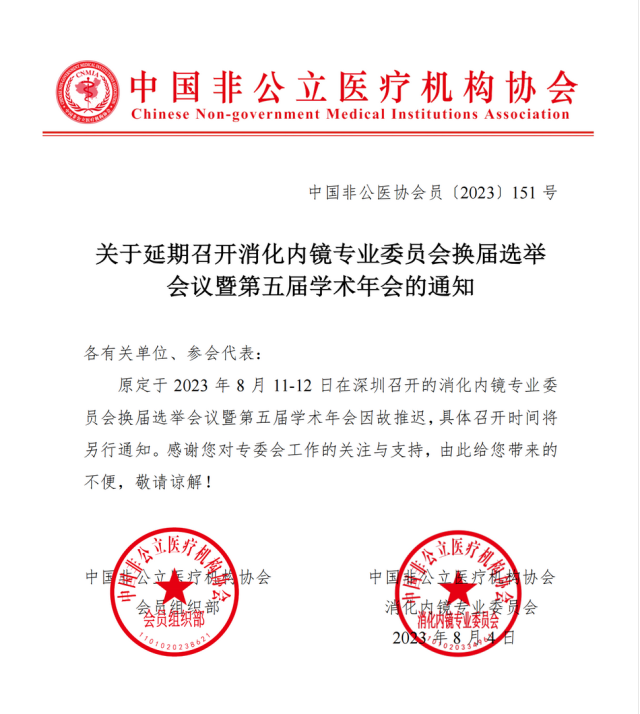 消化內(nèi)鏡專業(yè)委員會(huì)換屆選舉會(huì)議暨第五屆學(xué)術(shù)年會(huì)延期通知。圖片來源:中國非公立醫(yī)療機(jī)構(gòu)協(xié)會(huì)