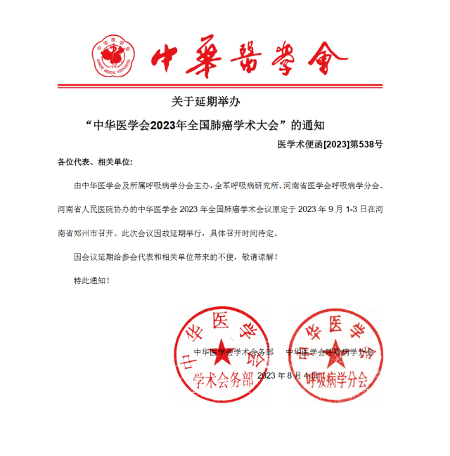 8月4日,中華醫(yī)學(xué)會(huì)2023年全國肺癌學(xué)術(shù)會(huì)議原定于2023年9月1-3日在河南省鄭州市召開,因故延期舉行,具體召開時(shí)間待定。
