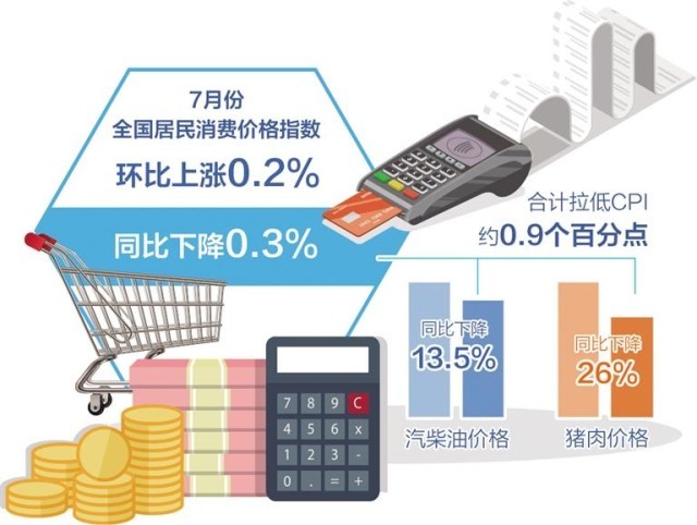 國(guó)家統(tǒng)計(jì)局?jǐn)?shù)據(jù)顯示,今年7月份全國(guó)居民消費(fèi)價(jià)格指數(shù)(CPI)環(huán)比上漲0.2%,由降轉(zhuǎn)漲;同比由上月持平轉(zhuǎn)為下降0.3%。工業(yè)生產(chǎn)者出廠價(jià)格指數(shù)(PPI)環(huán)比、同比降幅均收窄。