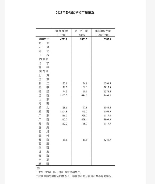 國家統(tǒng)計(jì)局今天發(fā)布數(shù)據(jù)顯示,2023年,全國早稻總產(chǎn)量566.7億斤,比2022年增加4.3億斤,增長(zhǎng)0.8%。全國早稻播種面積7099.7萬畝,單位面積產(chǎn)量399.1公斤/畝,比2022年增加4.8公斤/畝,增長(zhǎng)1.2%。