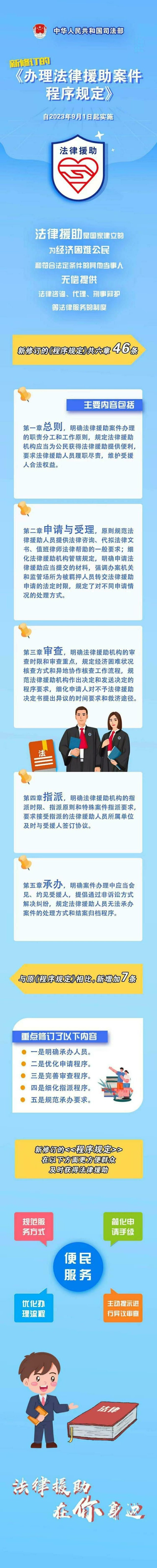 為貫徹落實(shí)法律援助法,提高法律援助案件辦理程序的標(biāo)準(zhǔn)化規(guī)范化水平,司法部對2012年公布并施行的《辦理法律援助案件程序規(guī)定》進(jìn)行了全面修訂,修訂后的《程序規(guī)定》,在方便群眾及時獲得法律援助、提高法律援助服務(wù)質(zhì)量等方面,作出了一系列具體規(guī)定。《程序規(guī)定》自2023年9月1日起施行。