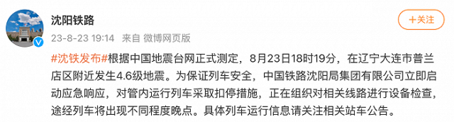 央視網消息:據@沈陽鐵路 微博消息,根據中國地震臺網正式測定,8月23日18時19分,在遼寧大連市普蘭店區(qū)附近發(fā)生4.6級地震。為保證列車安全,中國鐵路沈陽局集團有限公司立即啟動應急響應,對管內運行列車采取扣停措施,正在組織對相關線路進行設備檢查,途經列車將出現不同程度晚點。具體列車運行信息請關注相關站車公告。