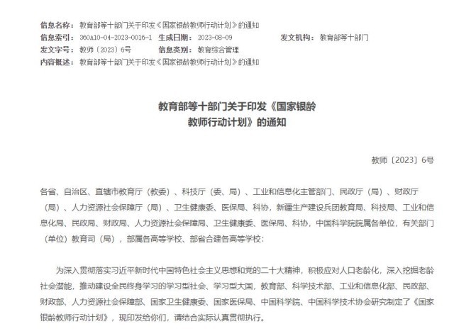 央視網(wǎng)消息:據(jù)教育部,為深入貫徹落實習(xí)近平新時代中國特色社會主義思想和黨的二十大精神,積極應(yīng)對人口老齡化,深入挖掘老齡社會潛能,推動建設(shè)全民終身學(xué)習(xí)的學(xué)習(xí)型社會、學(xué)習(xí)型大國,教育部、科學(xué)技術(shù)部、工業(yè)和信息化部、民政部、財政部、人力資源社會保障部、國家衛(wèi)生健康委、國家醫(yī)保局、中國科學(xué)院、中國科學(xué)技術(shù)協(xié)會研究制定了《國家銀齡教師行動計劃》,現(xiàn)印發(fā)給你們,請結(jié)合實際認(rèn)真貫徹執(zhí)行。
