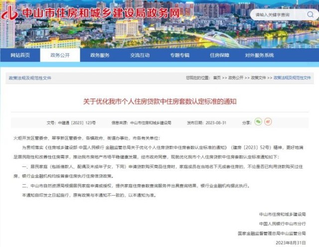 中新網(wǎng)8月31日電 據(jù)廣東省中山市住房和城鄉(xiāng)建設(shè)局網(wǎng)站消息,31日,中山市住房和城鄉(xiāng)建設(shè)局、中國人民銀行中山市分行、國家金融監(jiān)督管理總局中山監(jiān)管分局等三部門聯(lián)合發(fā)布《關(guān)于優(yōu)化我市個人住房貸款中住房套數(shù)認(rèn)定標(biāo)準(zhǔn)的通知》。通知提出,居民家庭(包括借款人、配偶及未成年子女,下同)申請貸款購買商品住房時,家庭成員在當(dāng)?shù)孛聼o成套住房的,不論是否已利用貸款購買過住房,銀行業(yè)金融機(jī)構(gòu)均按首套住房執(zhí)行住房信貸政策。