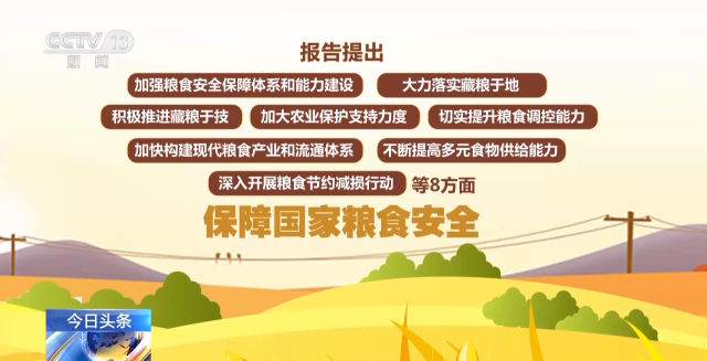 報(bào)告提出,將從加強(qiáng)糧食安全保障體系和能力建設(shè)、大力落實(shí)藏糧于地、積極推進(jìn)藏糧于技、加大農(nóng)業(yè)保護(hù)支持力度、切實(shí)提升糧食調(diào)控能力、加快構(gòu)建現(xiàn)代糧食產(chǎn)業(yè)和流通體系、不斷提高多元食物供給能力、深入開(kāi)展糧食節(jié)約減損行動(dòng)等8方面,保障國(guó)家糧食安全。