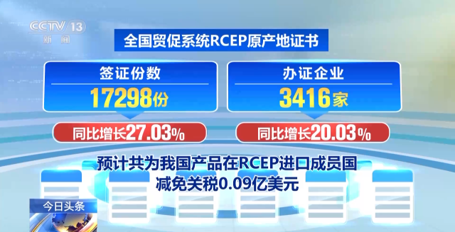 中國(guó)貿(mào)促會(huì)8月30日介紹:今年7月份,全國(guó)貿(mào)促系統(tǒng)累計(jì)簽發(fā)原產(chǎn)地證書(shū)等各類證書(shū)54.62萬(wàn)份,較上年同比增長(zhǎng)12.82%。全國(guó)貿(mào)促系統(tǒng)RCEP原產(chǎn)地證書(shū)簽證份數(shù)為17298份,同比增長(zhǎng)27.03%;辦證企業(yè)3416家,同比增長(zhǎng)20.03%,預(yù)計(jì)共為我國(guó)產(chǎn)品在RCEP進(jìn)口成員國(guó)減免關(guān)稅0.09億美元。